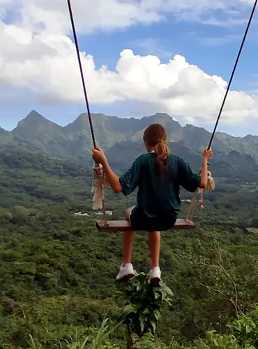 The hike begins at the heart of the marae, ancestral places of worship, where history and spirituality accompany the walk. The trail continues on to the Trois Pinus, a site that has become a must-see, famous for its suspended swing facing Mount Rotui.