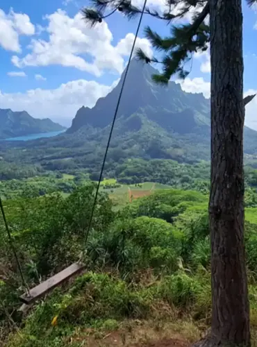 En suivant le sentier des ancêtres, la marche débute au cœur des marae, dans une atmosphère chargée de mana. Le chemin mène ensuite aux Trois Pinus, où une balançoire suspendue invite à l’émerveillement face aux reliefs volcaniques.