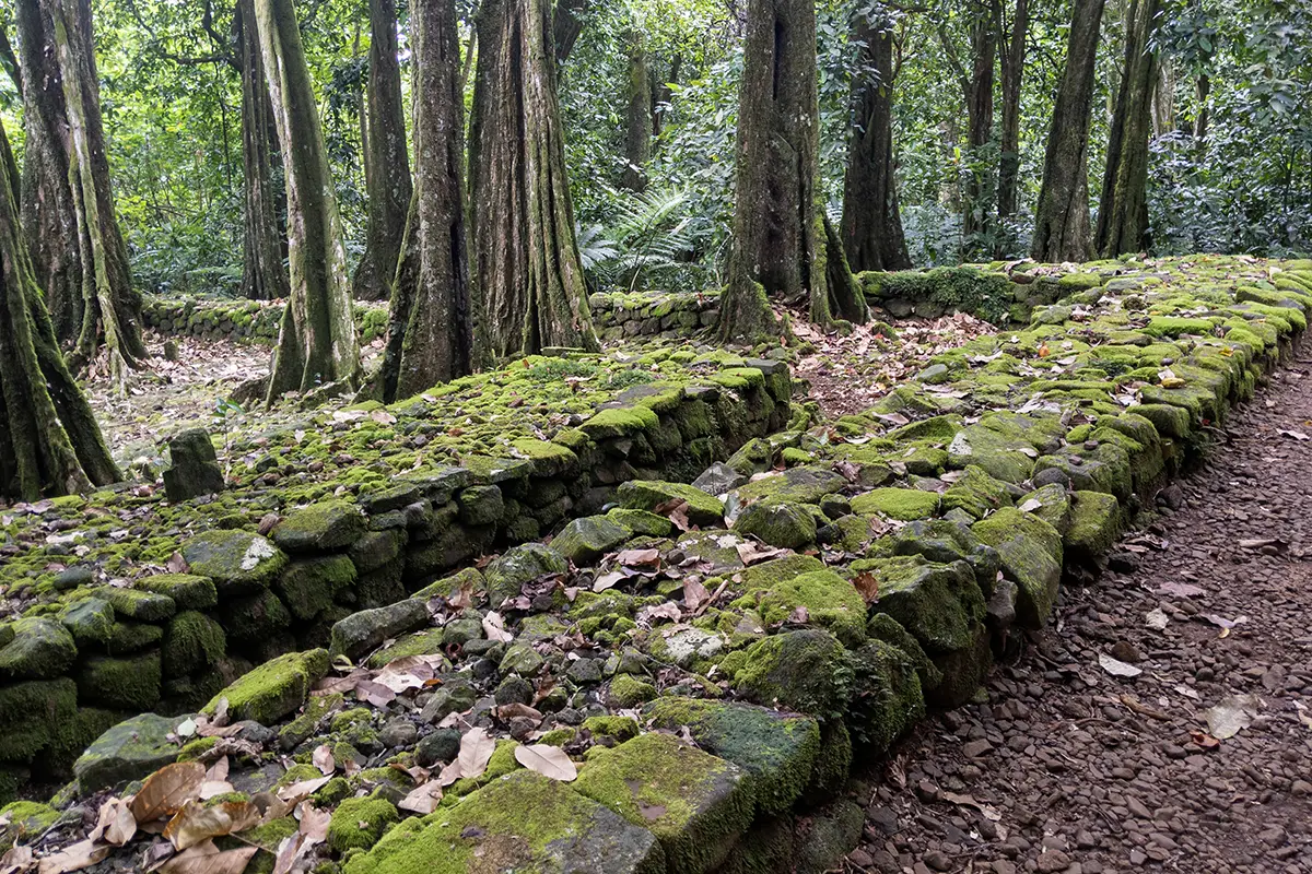 Cette randonnée commence dans une atmosphère plus intime, au fil du sentier des marae de Moorea. Ici, le rythme ralentit naturellement. Les marae ne sont pas seulement des vestiges : ils sont intégrés au paysage, presque discrets, et invitent à observer autrement. La marche devient plus attentive, plus ancrée.